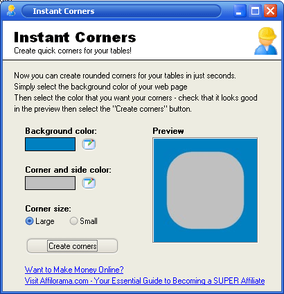 You can choose whether you want “large” corners or “small” corners. Then hit “create corners”! Instant Corners creates four corners, four sides and also an HTML page with the corners laid out in a table. You can choose to use the HTML provided by Instant Corners or just ignore it and create your own in your HTML editor of choice.
